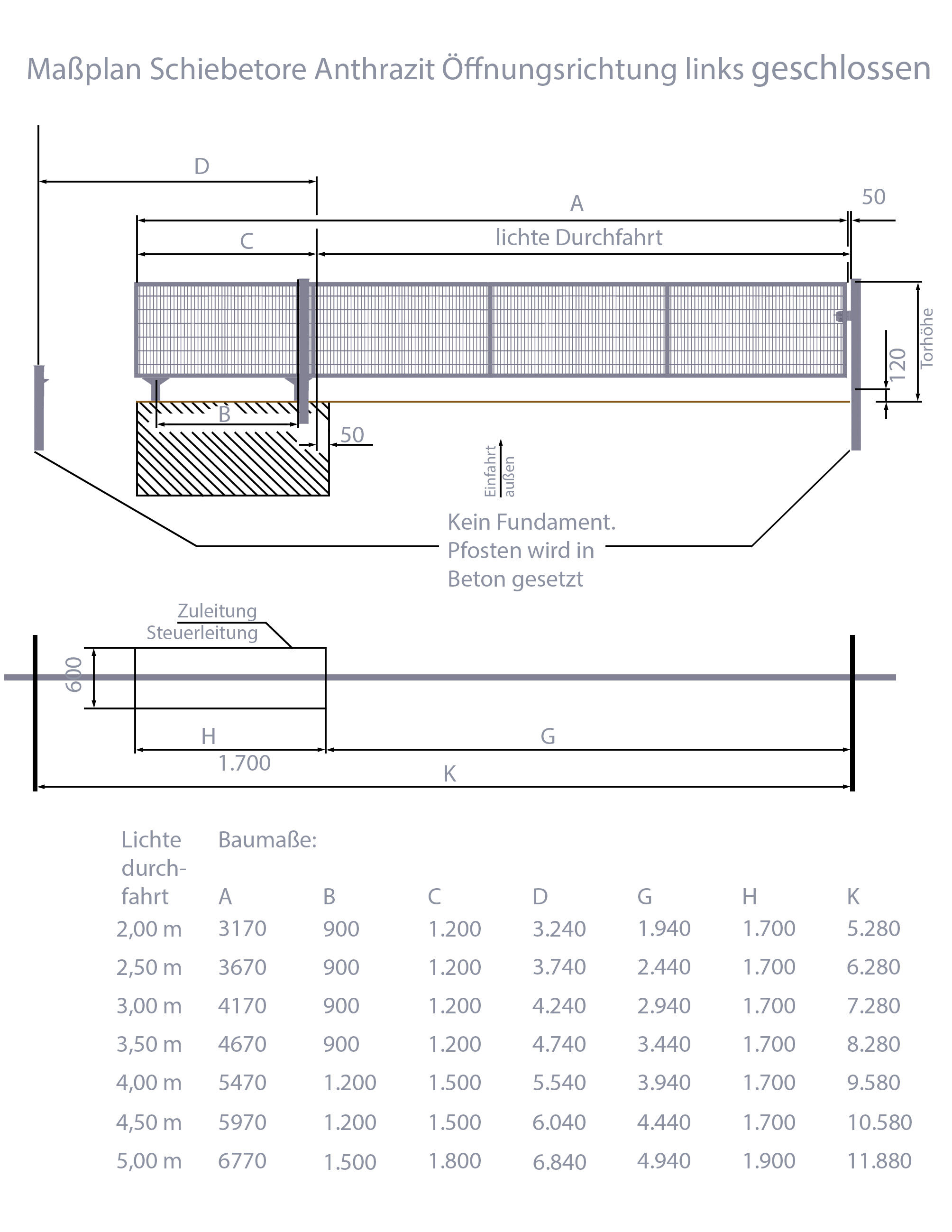 Bei der Breite vom Automatisches Schiebetor Breite: 450cm; Höhe: 160cm; Anthrazit; 8/6/8mm Doppelstabmatten-Füllung; Öffnet nach links muss man zwischen der Durchfahrtsbreite, Gesamtbreite bei geschlossenem Tor und der Gesamtbreite bei geöffnetem Tor unterscheiden. Die Durchfahrtsbreite beträgt bei diesem Modell 450 cm. Ist das Schiebetor geschlossen, beträgt die Gesamtbreite 597 cm. Ist der Torflügel komplett geöffnet, beträgt die Gesamtbreite vom Automatisches Schiebetor Breite: 450cm; Höhe: 160cm; Anthrazit; 8/6/8mm Doppelstabmatten-Füllung; Öffnet nach links 1058 cm. Entsprechend viel Platz muss auch für die Montage des Schiebetores berücksichtigt werden. Alle Details zu den verschiedenen Maßen können Sie den Bildern entnehmen.