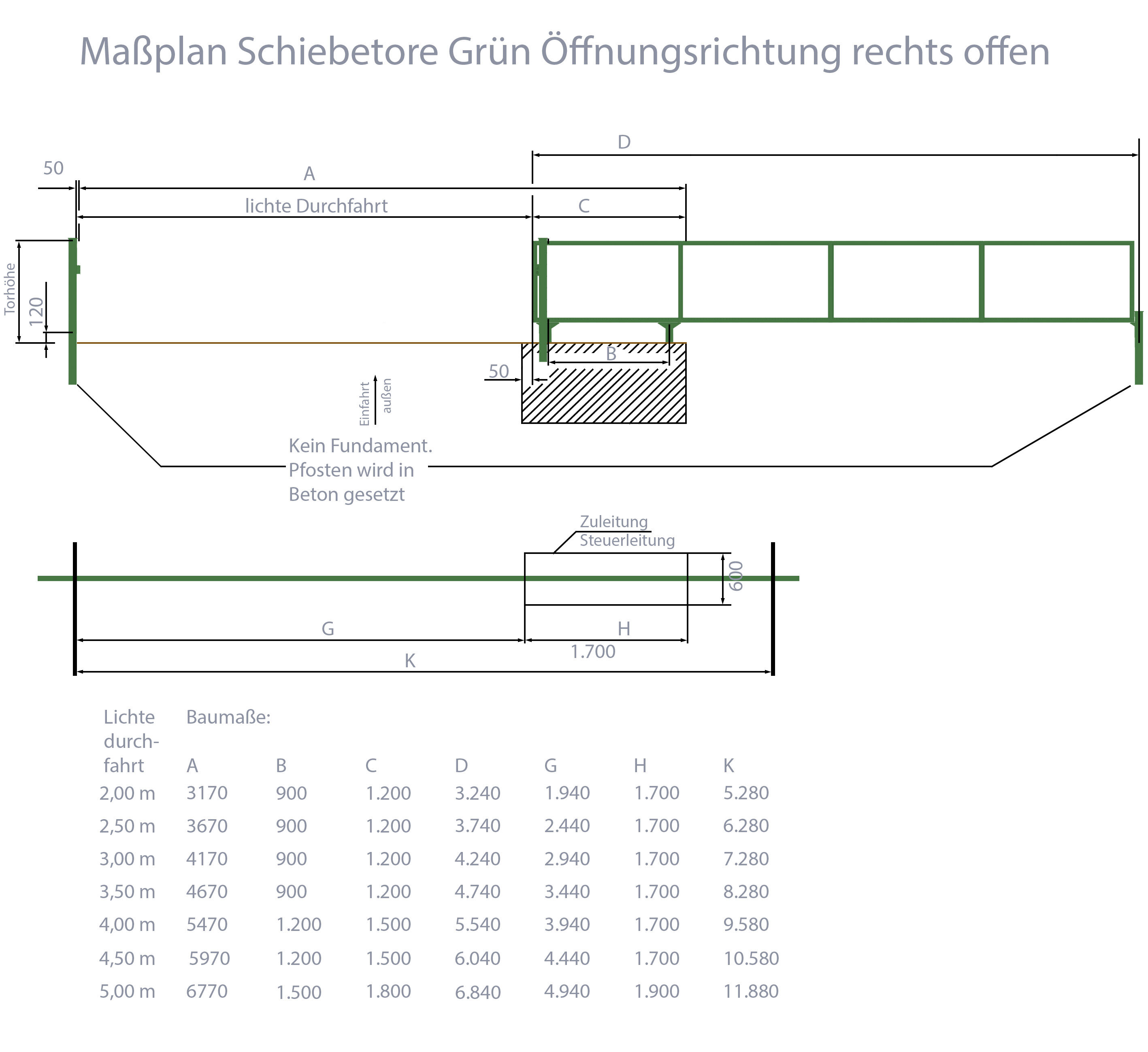 Höhe, Breite und Gesamtbreite vom Automatisches Schiebetor Breite: 450cm; Höhe: 180cm; Grün; ohne Füllung; Öffnet nach rechts