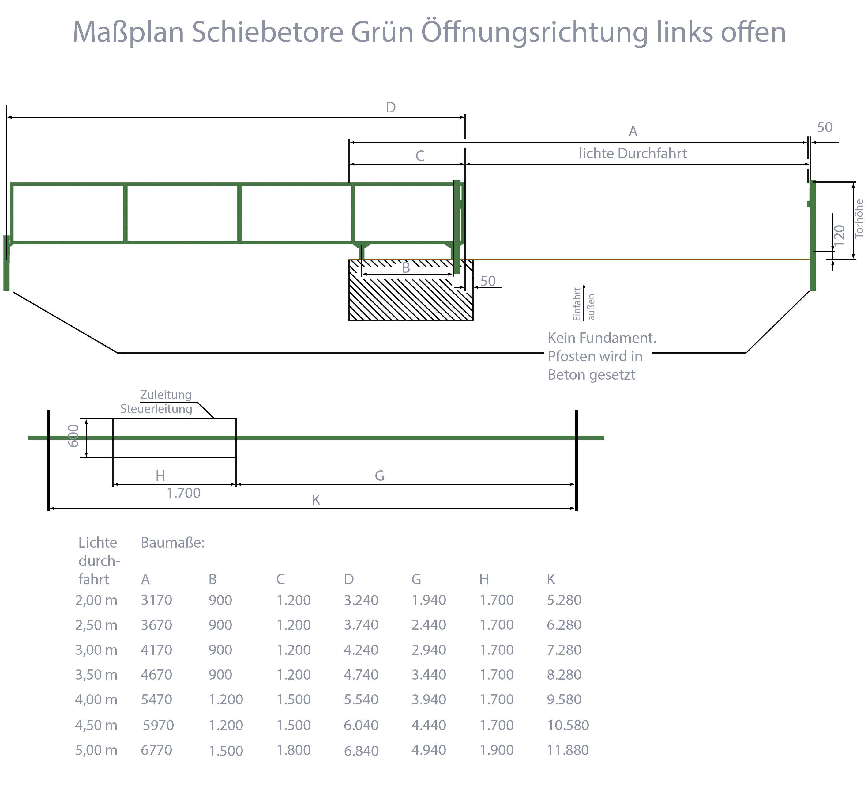 Höhe, Breite und Gesamtbreite vom Automatisches Schiebetor Breite: 500cm; Höhe: 180cm; Grün; ohne Füllung; Öffnet nach links
