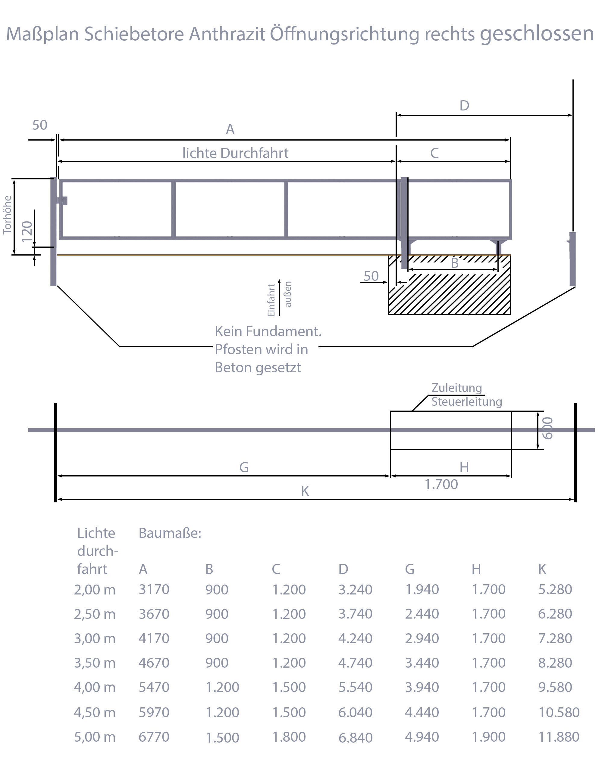 Technische Daten Schiebetor Breite: 250cm; Höhe: 120cm; Anthrazit; ohne Füllung; Öffnet nach rechts: