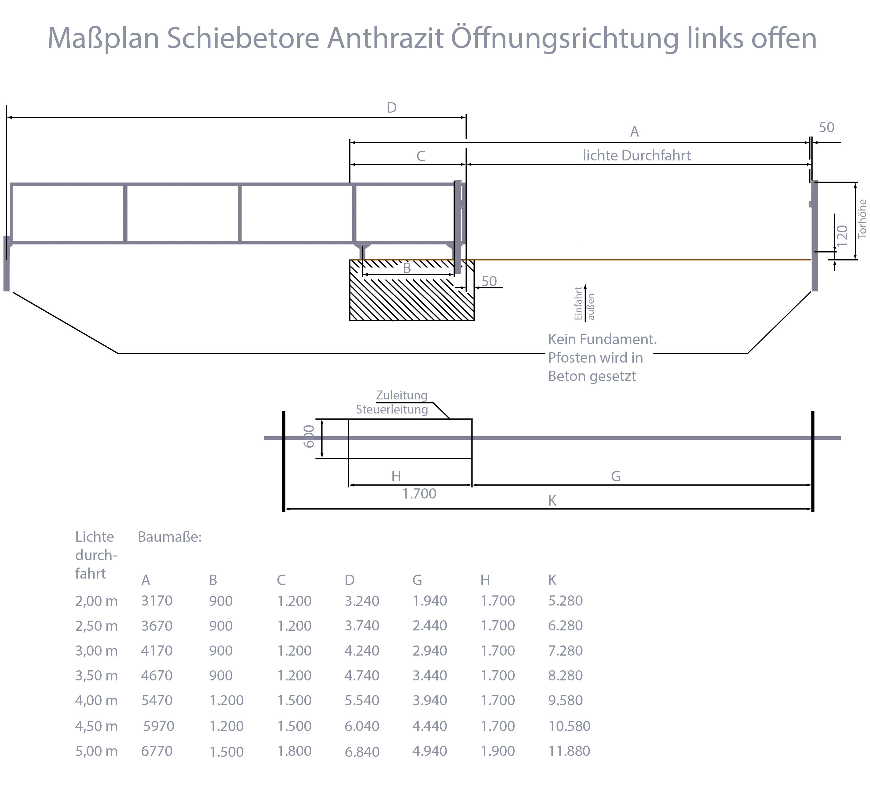 Technische Daten Schiebetor Breite: 250cm; Höhe: 140cm; Anthrazit; ohne Füllung; Öffnet nach links: