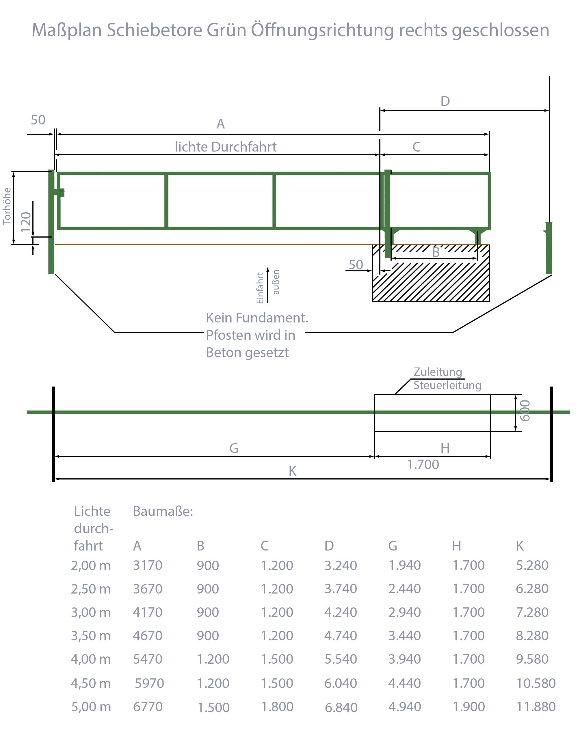 Technische Daten Schiebetor Breite: 300cm; Höhe: 100cm; Grün; ohne Füllung; Öffnet nach rechts: