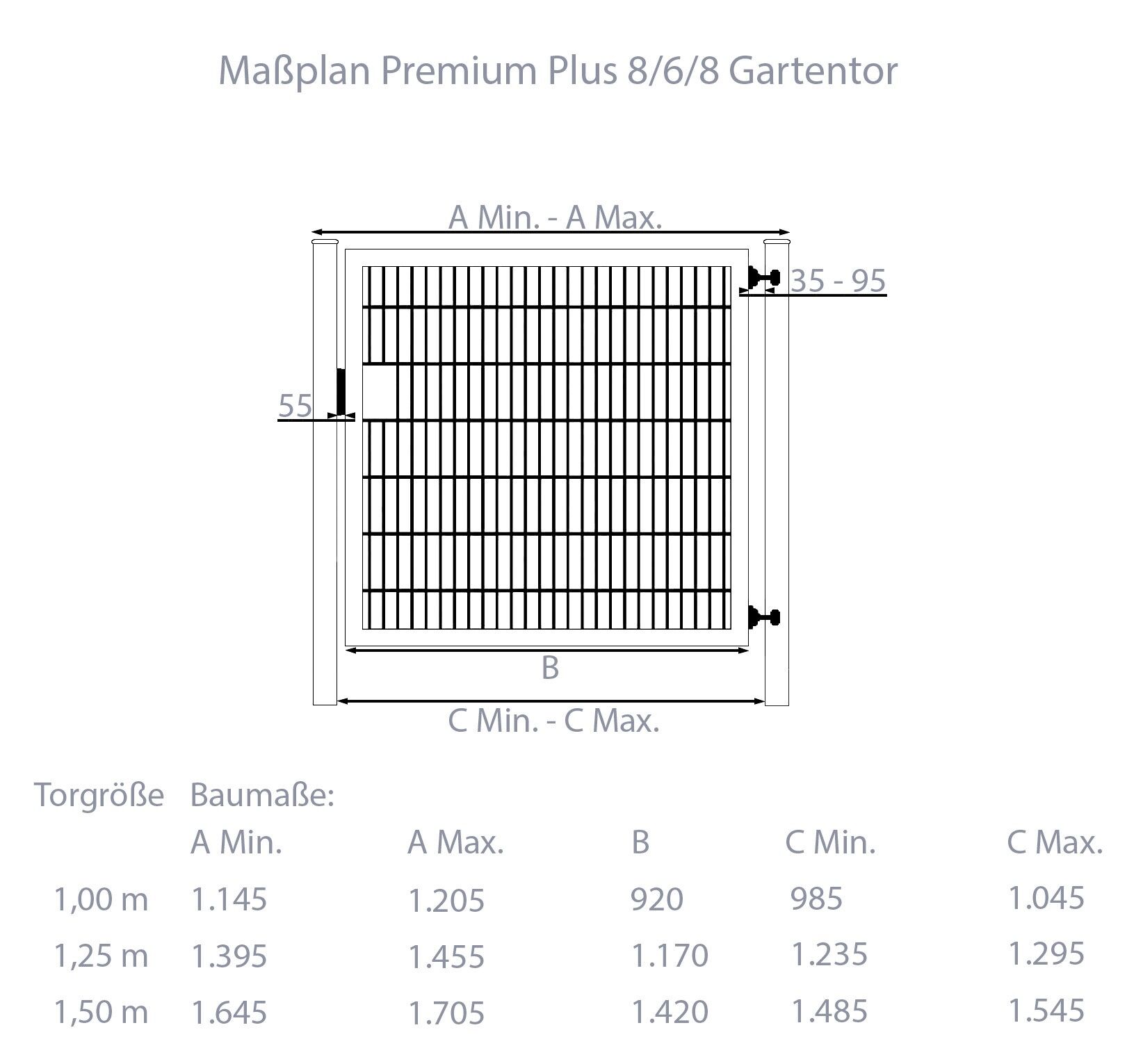 | Premium-Plus 8/6/8 | - Torfüllung: 8/6/8mm-Doppelstabmatte - Rahmen: 60x40mm Rechteck-Stahlrohr - Torpfosten: 80x80mm-, 100x100mm- oder 120x120mm-Quadrat-Stahlrohr (je nach Breite) | - Montagematerial - Hochwertiges Industrie-Torschloss inkl. Drückergarnitur - Bei 2- und 3-flügeligen Toren zus. Bodenriegel, Gegenblech, Anschlag | - Extrem robuste Tor-Konstruktion mit schwerer Mattenfüllung - Ideal auch im gewerblichen Umfeld - Kompletter Lieferumfang - 5 Jahre Garantie | ↗ Einflügelige Premium-Plus-Tore (8/6/8) | |||