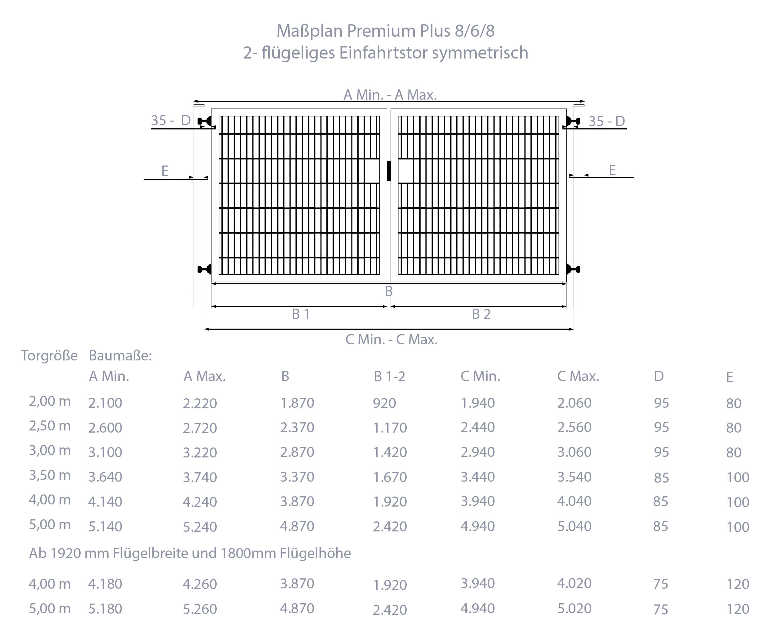 • Verteilung der Torflügel: symmetrisch, Breite 1. Flügel 92 cm, Breite 2. Flügel 92 cm